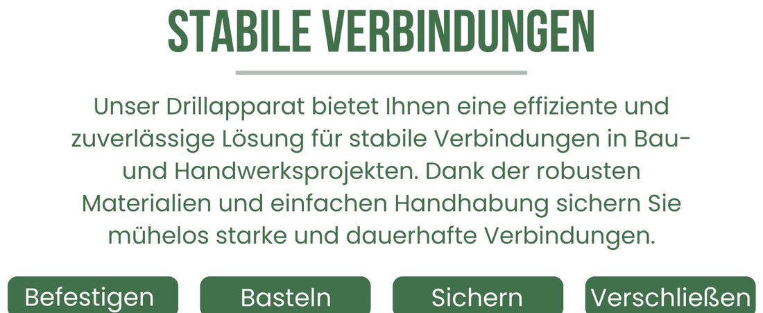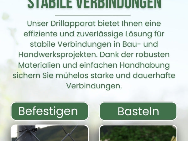 Der Drillapparat von Heimfleiss ist das ideale Werkzeug für Bau, Garten und Handwerk. Mit seiner robusten Konstruktion und hochwertigen Materialien garantiert er präzises Arbeiten und eine lange Lebensdauer.