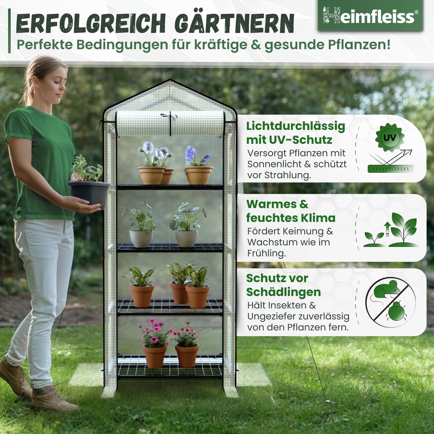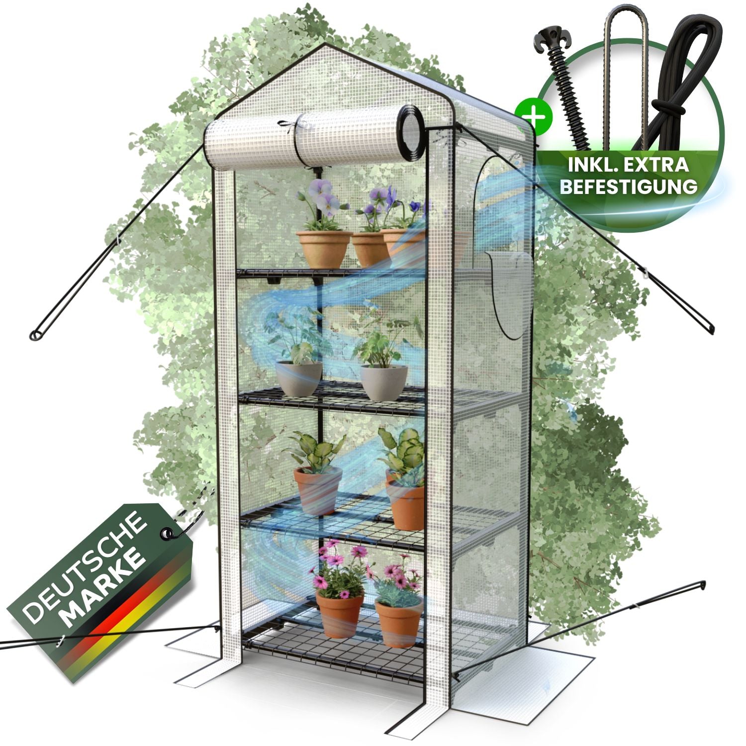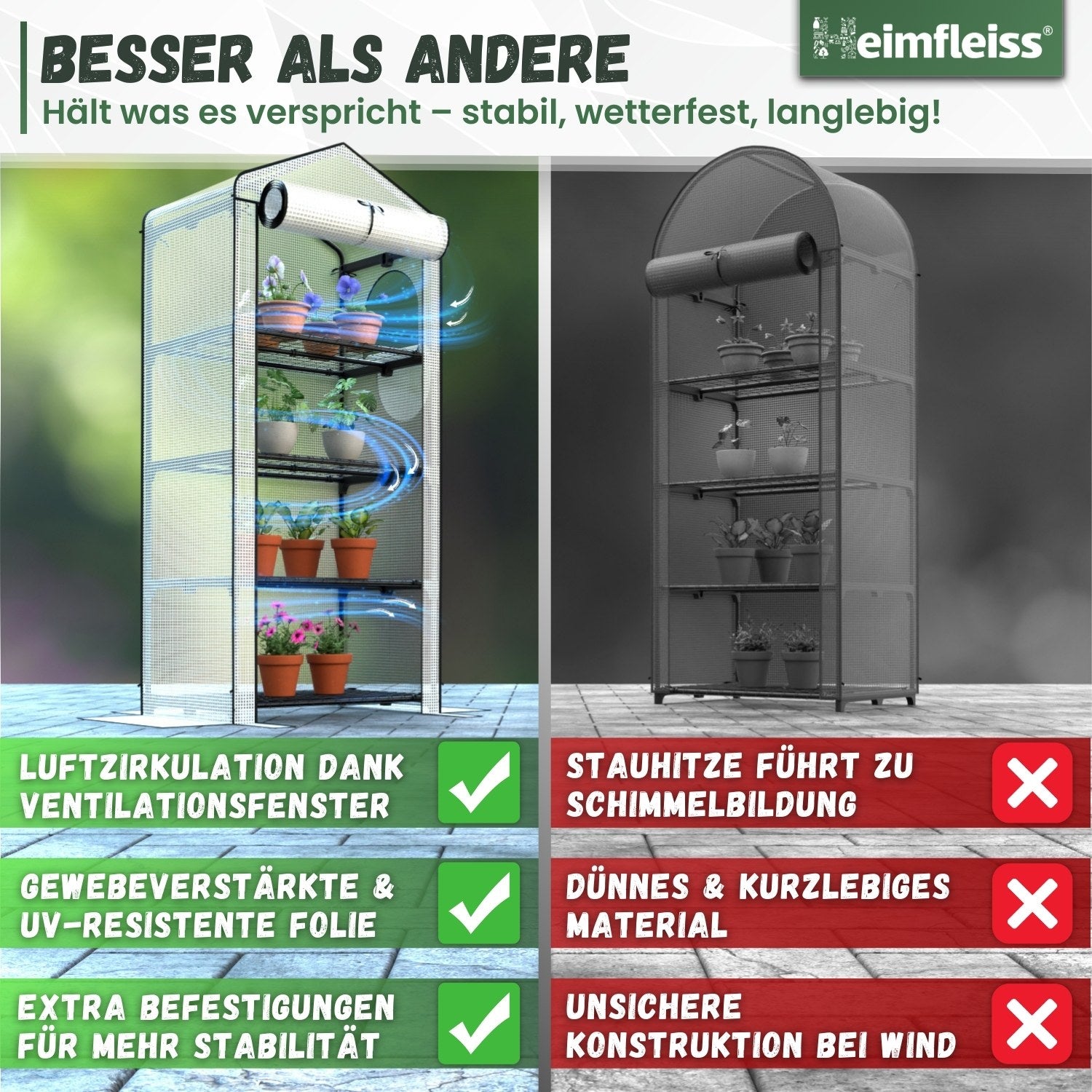 Das Heimfleiss Foliengewächshaus mit 4 Etagen ist die ideale Lösung für alle Hobbygärtner mit wenig Platz. Ob auf dem Balkon, der Terrasse oder im kleinen Garten – dieses kleine Gewächshaus bietet dir optimale Bedingungen für die Aufzucht von Pflanzen, Kräutern oder Gemüse. Dank der kompakten Maße passt es auch in enge Bereiche und ist gleichzeitig geräumig genug für eine Vielzahl von Pflanzen.