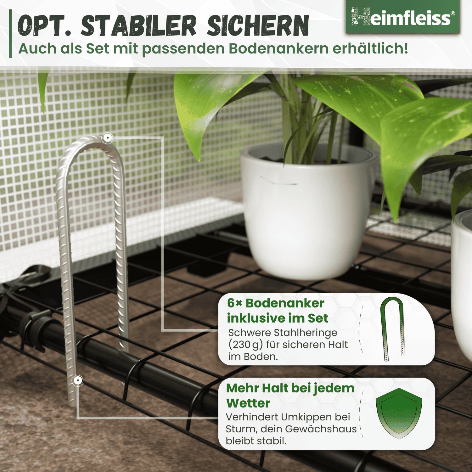 Ja, das Foliengewächshaus ist dank seiner stabilen Stahlrahmenkonstruktion und der verstärkten PE-Gitterfolie sehr wetterbeständig. Für zusätzlichen Halt bei starkem Wind empfehlen wir die Nutzung der beiliegenden Windseile – oder du entscheidest dich direkt für die Set-Variante mit 8 Bodenankern für noch mehr Standfestigkeit.