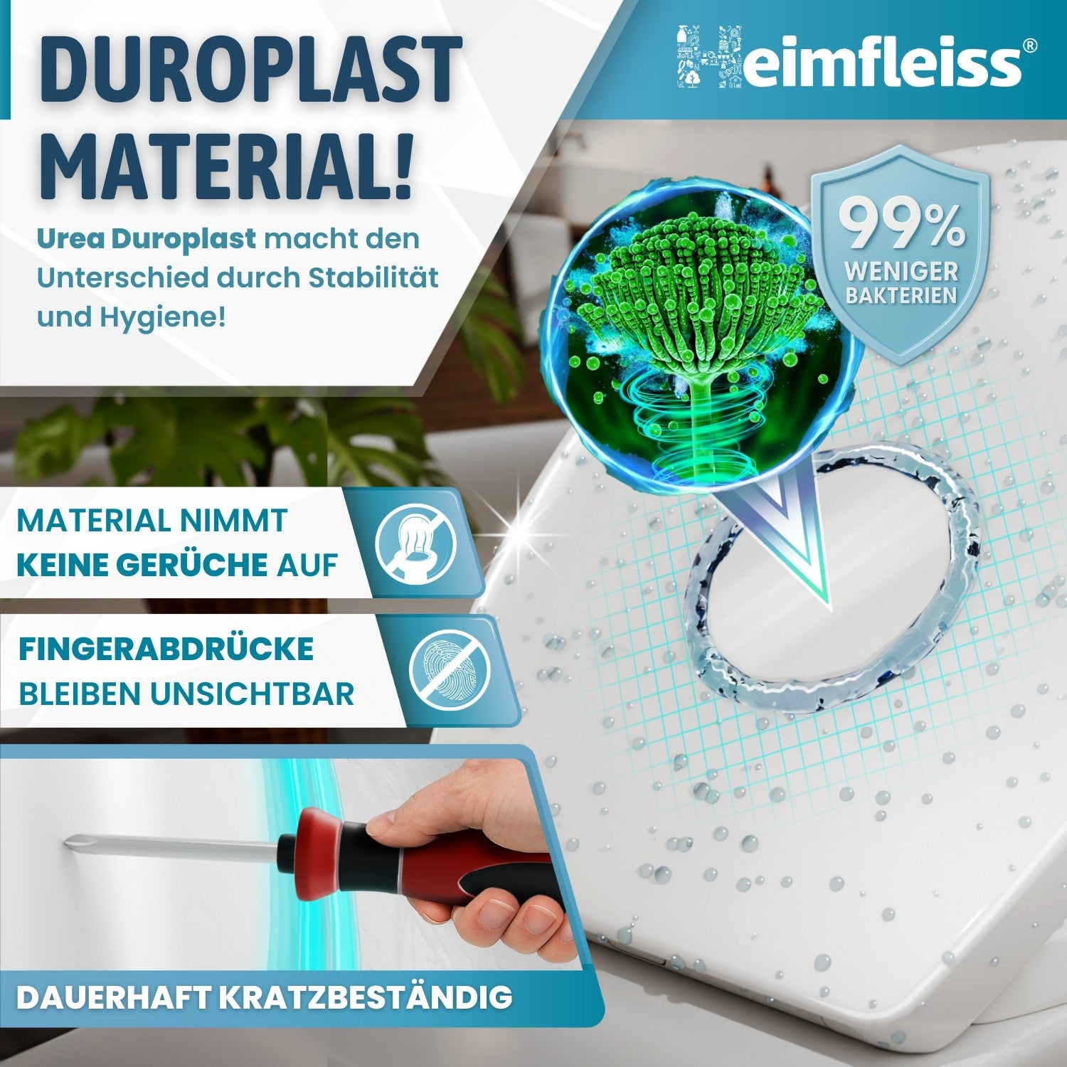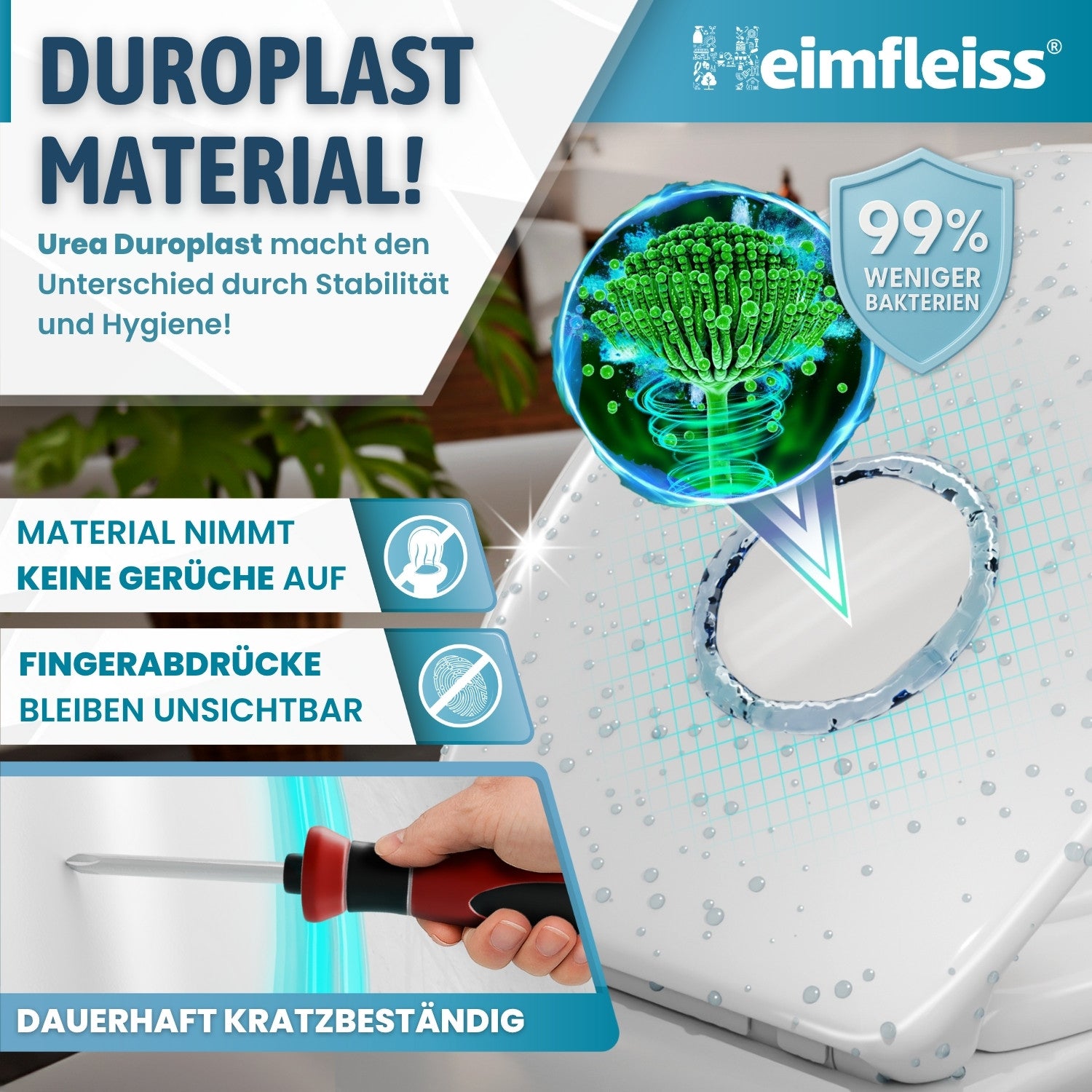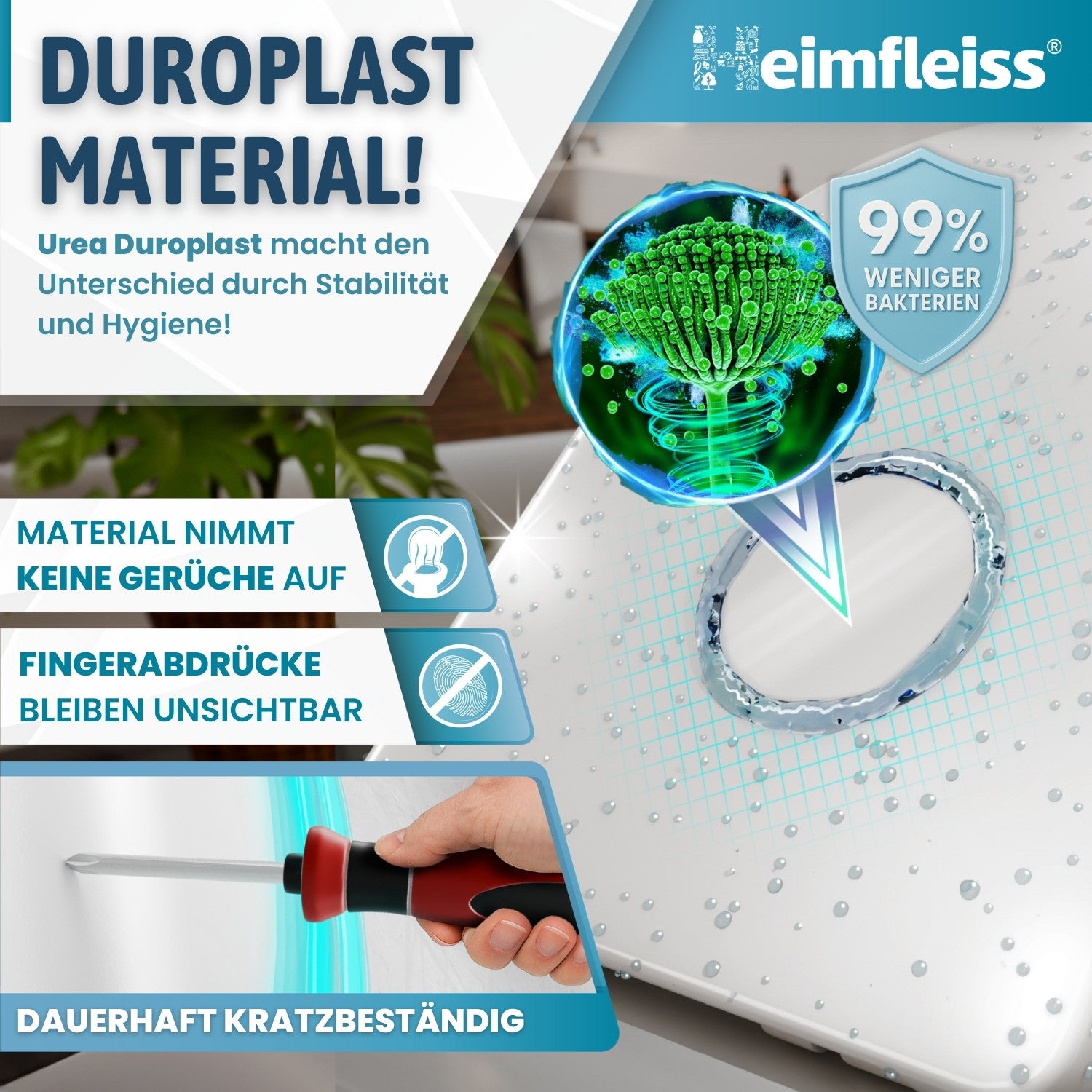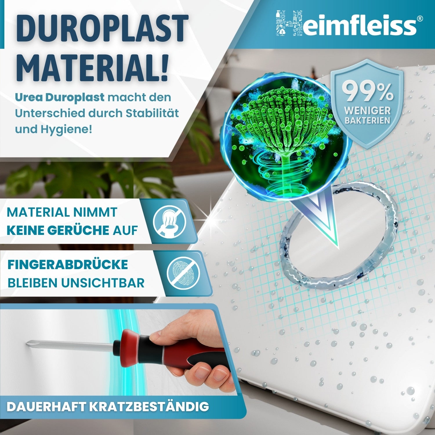 - Material: Premium Urea-Duroplast – antibakteriell, antistatisch und besonders widerstandsfähig